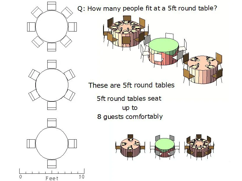 At The Space Rentals, we know the importance of creating comfortable seating arrangements for your events. For example, a 5ft round table comfortably seats 8 guests—despite what some sources might claim about fitting 10. We believe in providing accurate information backed by professional event planning tools.